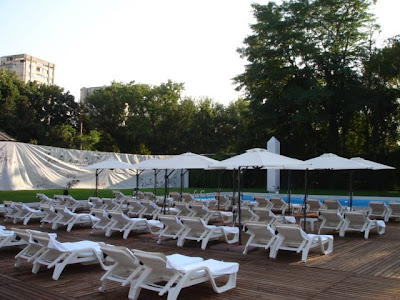 În seara asta am fost la deschiderea celei mai noi terase din Bucureşti. Terasă e puţin spus, pentru că este şi restaurant şi piscină. White Club este situat pe patinoarul Floreasca. Nu, nu este încă un loc de agrement aruncat pe apa sâmbetei, pentru că la iarnă, locaţia îşi va relua funcţia care a consacrat-o. Piscina e mică, dar terasa este mare şi elegantă.