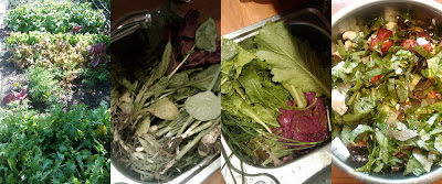 Şi mătuşă-mea are o aplecare specială spre gătit (e moldoveancă!) şi spre încercat diverse reţete şi delicatesuri. Ăsta e unul din multele aspecte la care semăn cu ea. Dar ei îi place şi să grădinărească, aşa că îşi cumpără diverse seminţe şi plantează cele mai interesante chestii care pot fi cultivate în clima asta. Spre exemplu, ultimul hit sunt „sălăţurile” asiatice. Din care am mâncat la ea la masă şi mi-am cules şi pentru acasă. Da, eu, cu mânuţele astea două, m-am mozolit în pământul umed şi am cules diverse tipuri de salată, lobodă, ceapă, usturoi, spanac şi spanac-bebe (aka baby spinach) şi ridichi din alea albe şi lunguieţe. După care am venit acasă şi le-am curăţat şi în final am făcut o salată cu diverse sortimente asiatice, feta, căpşuni şi castravete. Un deliciu!