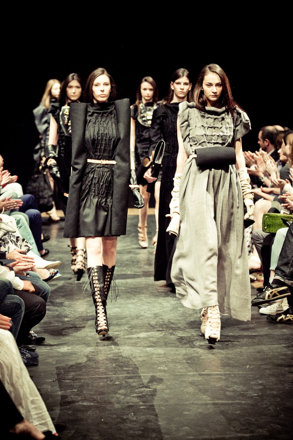 După cum vă ziceam ieri, luni seară am fost la o prezentare de modă a trei designeri mai mult sau mai puţin cunoscuţi. A fost deschiderea unei serii de evenimente sub egida Opera Fashion, prezentări de modă ce se ţin la Opera Română. Cadrul a fost destul de potrivit pentru aşa ceva. Ce m-a surprins, însă, a fost lumea prezentă, care, cu mici excepţii, nu reprezintă publicul obişnuit la astfel de manifestări.Au fost trei prezentări: prima a fost Carmen Secăreanu, cu o colecţie în note caracteristice; a doua, o surpriză pentru mine, a fost colecţia Cristhelen B (ceea ce vedeţi în poze), adică Cristina Bâtlan, designerul marochinăriei Musette şi al liniei de lux Cristhelen B; iar a treia colecţie a fost a lui Iris Şerban. Spun că a fost o surpriză pentru că deşi citisem că a făcut senzaţie cu colecţia sa de haine la Cluj Fashion Week, îmi ieşise din minte, şi pentru că mi-a plăcut foarte mult linia definitorie a pieselor.