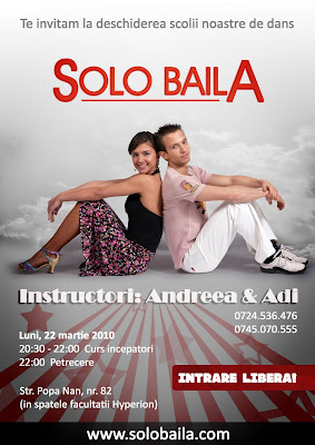 Diseară e marea deschidere a celei mai noi şcoli de salsa din Bucureşti. De ce vă spun chestia asta? Nu pentru că aş fi mare fan salsa (îmi dau cu stângul în dreptul big time), deşi muzica în sine îmi place, ci pentru că îi ştiu pe instructori şi ştiu de ce sunt capabili. Andreea mi-a fost chiar colegă de cameră şi toată ziua şi-o petrecea într-un dans. Aşa că vă invit la Solo Baila, mai ales că e foarte accesibil ca locaţie, orar şi preţ. Pentru început sunt doar cursuri pentru adulţi începători, dar instructorii promit să îşi diversifice clasele în funcţie de cerere. Aveţi cursuri luni de la 20:30 la 22:00 şi miercuri de la 19:00 la 20:30. Abonamentul costă 120 lei/ lună şi 100 lei pentru elevi şi studenţi. Mai multe informaţii găsiţi la numerele de telefon de pe afiş şi până una-alta vă invit în seara asta la cursul şi petrecerea de deschidere să vă faceţi şi voi o idee despre ce e vorba.